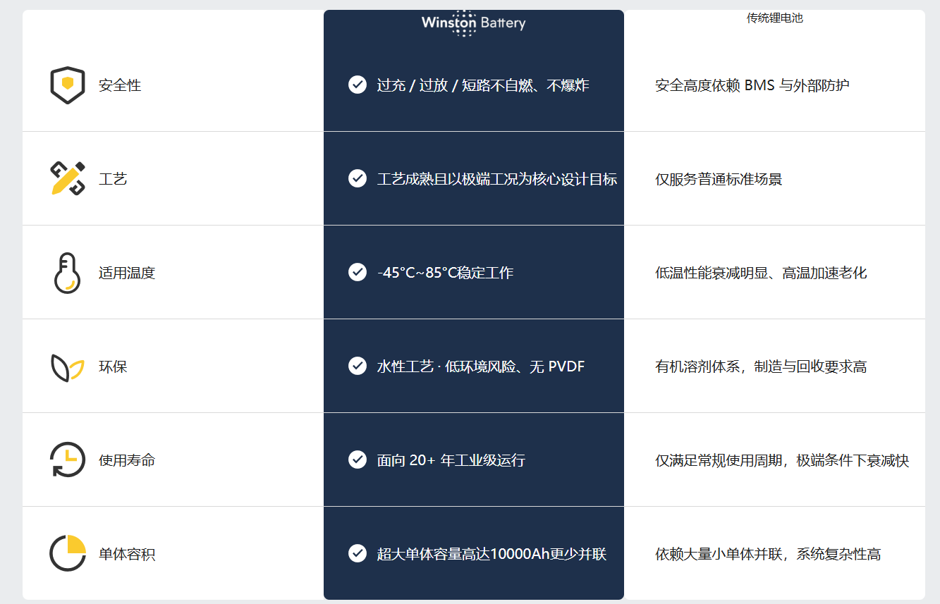 Winston Battery是全球领先的高安全水性 LYP 大容量电芯制造商,技术源于 1998 年的 Thunder Sky创始团队。我们专注 50Ah–10000Ah 超大容量体系,提供极致安全、长寿命、耐极端环境的储能基础技术。