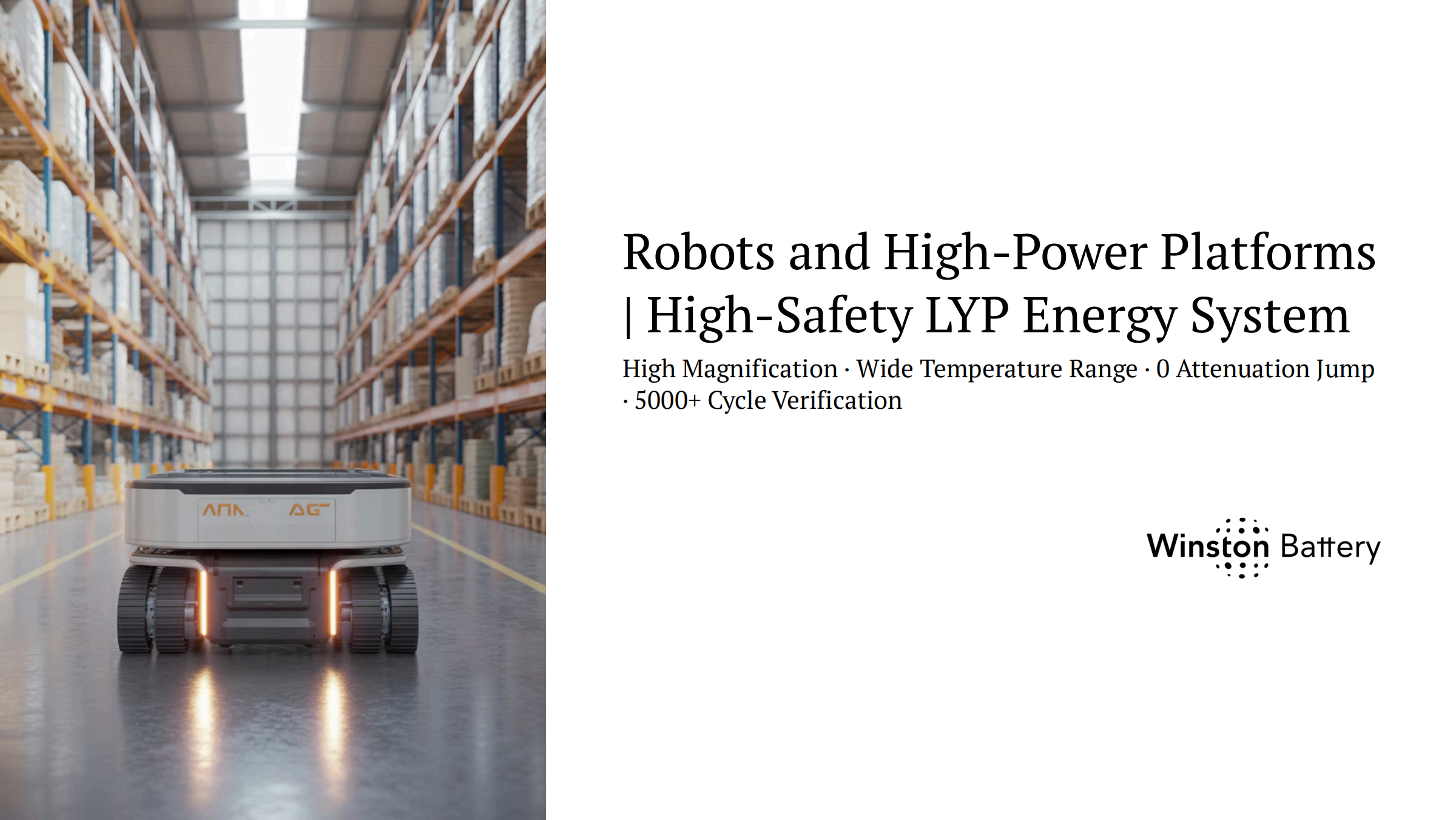 With wide temperature tolerance and long cycle life, Winston Battery LYP solutions support AGV/AMR systems, inspection robots, security patrol robots, quadruped robots, and heavy mobile platforms operating in demanding industrial and outdoor environments.